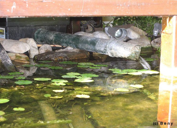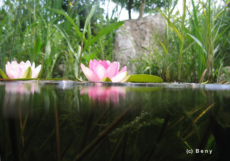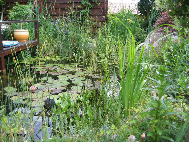 Voda v jezírku je stále tak čistá jak je vidět na fotkách a na videu. Samozřejmě, že mám řasy, ale ty se objeví jen na začátku jara, jak se voda oteplí a když převezmou svou funkci rostliny funkci, tak řasy mizí. Nepoužívám žádné přípravky proti řasám ani ničemu jinému. Moje motto je čím víc rostlin, tím je voda kvalitnější a čistší. V létě nechávám hladinu úplně