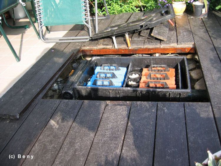 K filtraci slouží venkovním filtr, který je schovaný pod dřevěnou