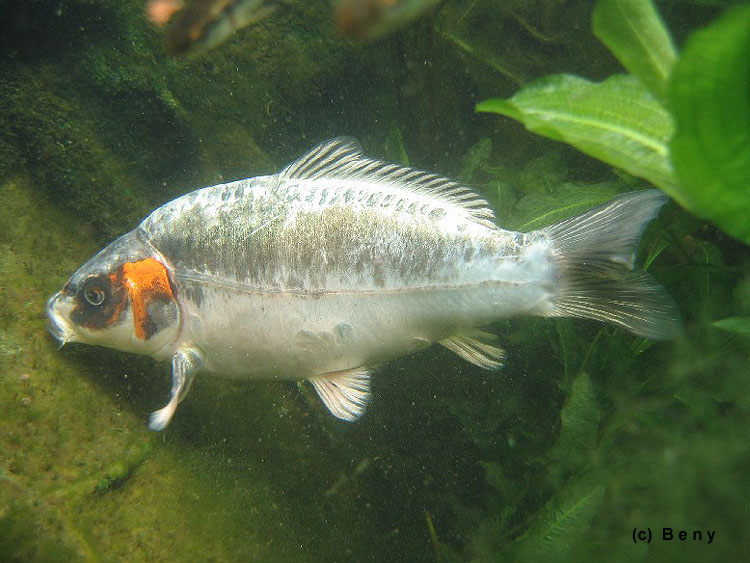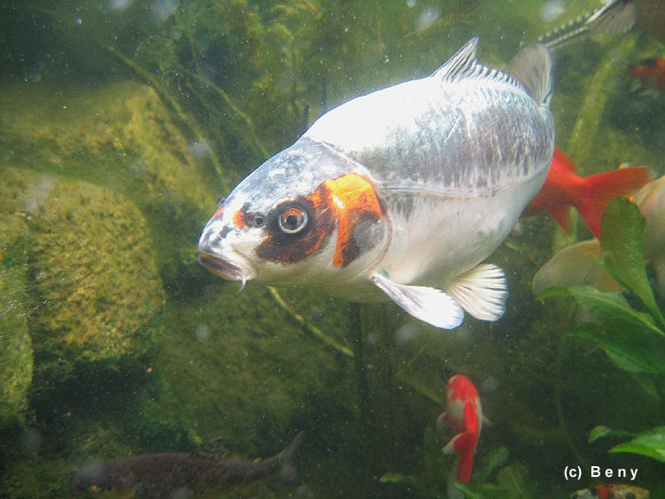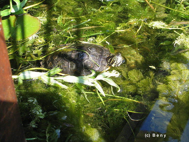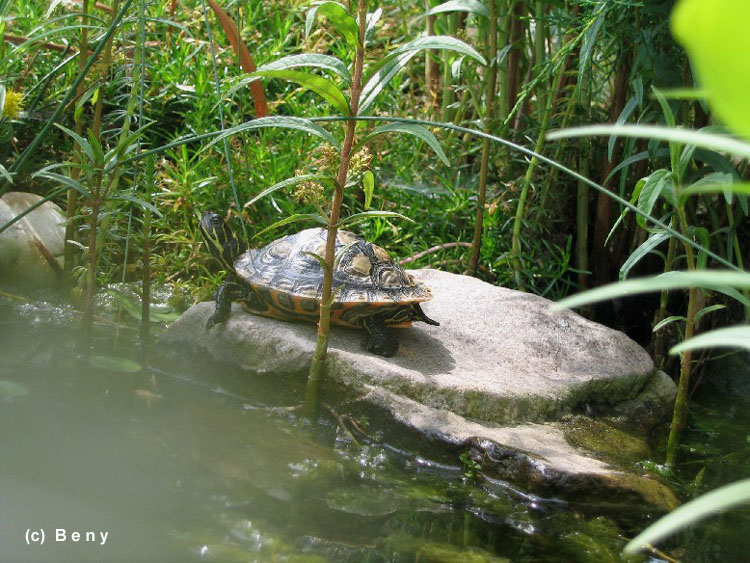 na okraji jezírka. Ten už žije v jezírku 4 roky. Pravděpodobně je to samička, protože