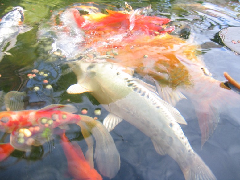 Co se potravy týká, koi kapry krmím na hladině a pro jesetery používám speciální granulované na dno. Je důležité vždy nejdříve nakrmit koi a pak teprve jesetery, protože by jim všechno sežrali. Jako delikatesu jim dávám mražené komáří larvy (patentky), krevetky a perloočky.