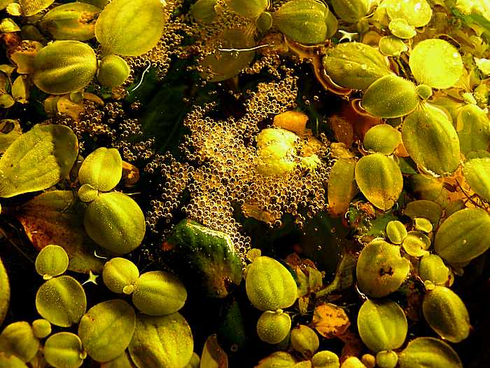 detail hnízda - malé sytě zbarvené "plné" útvary mezi bublinkami jsou jikry