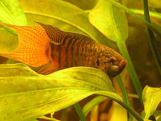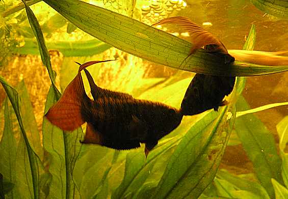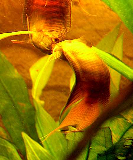 I když jsou v akváriu dva samci, každý obývá jiný roh a doposud se vzájemně ignorovali. V akváriu se jen občas "pošťuchovali" při krmení.