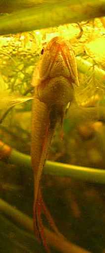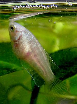 potěr se vykulí velmi rychle - asi za 24 hod. a sbírá různé drobné částečky z hladiny (zvětšeno), ve srovnání s potěrem sumců nebo živorodek je štíhlý a drobný