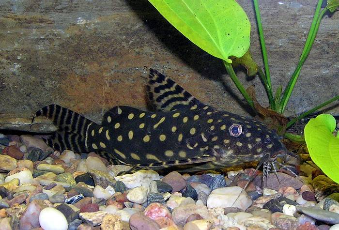Existuje více barevných variant. Nejčastější je u nich modročerný podklad s většími bílými tečkami. Jsou aktivní ve dne i v noci. V nádrži vyžadují zastíněná místa - jeskyně, skupiny rostlin.