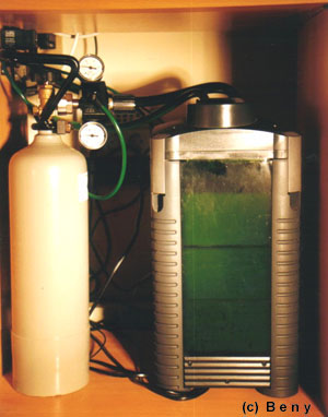 Kvůli rostlinám je v akváriu zabudováno i CO2 s 2 litrovou tlakovou lahví, která zásobuje nádrž.