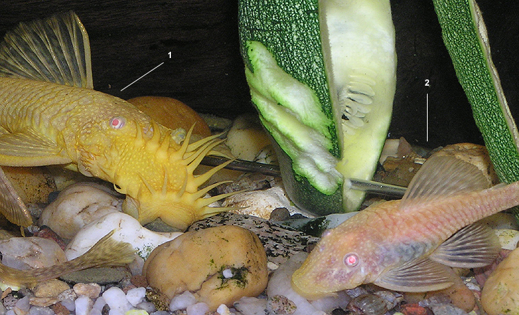 rozdíl v sytosti zabarvení u mláďat: 1 - "gold", 2 - albín