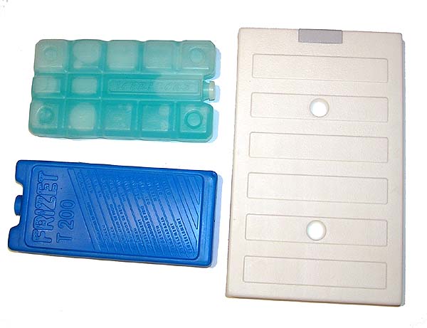 i modré mrazící vložky do přenosných ledniček, které necháme zmrazit a pro jistotu