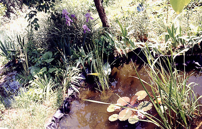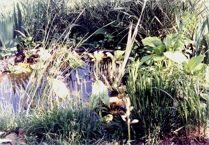 Kromě malého 450 l jezírka pořízeného loni, mám vybudované nižší jezírko pro bahenní rostliny. Základ byl vykopán do hloubky asi 35 cm, dál už kopat nešlo protože je zde pevná hornina (rula ?). Aby nedošlo k perforaci rybniční fólie (0,5 mm), byl na hlínu položen místo klasické geotextilie prokladový materiál používaný kromě jiného i při dopravě nerezových plechů (na paletách). Je to měkká asi 2 mm vysoká umělohmotná deska, na kterou byla teprve položena fólie. I když už mám jezírko napuštěné a jsou v něm rostliny, plži, pulci a vodoměrky, potřebuji ještě upravit okraje rybníčku a doladit břehy, co se týče osázení travinami, aby se zpevnila část zeminy a nebyla deštěm strhávána ze svahu dolů.