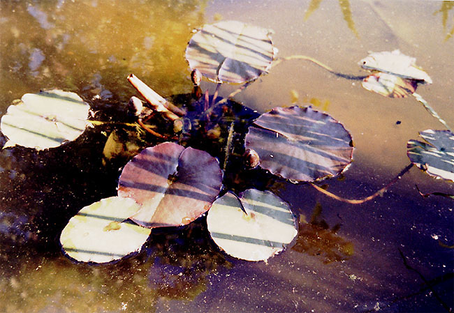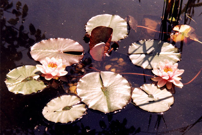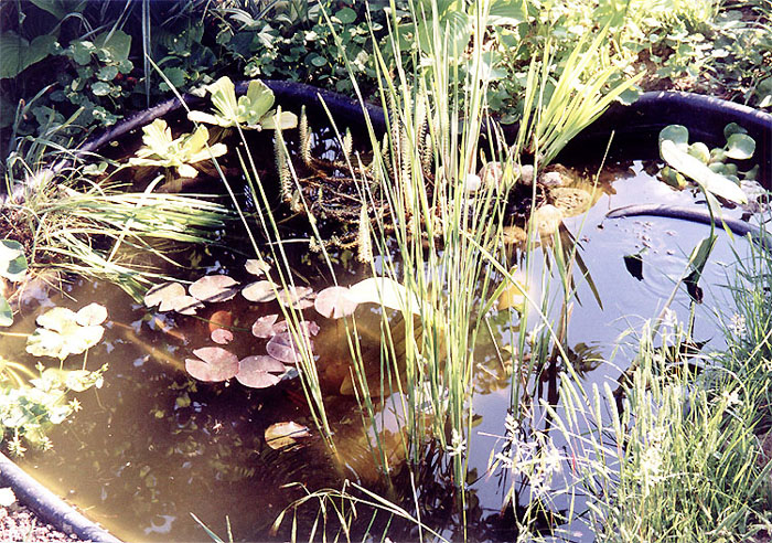 V novém jezírku je z rostlin především rákos, orobinec, teď již asi 70 cm vysoký Echinodorus přenesený z akvária a 2 růžové lekníny, z nichž jeden vytvořil asi 4 květy a stále se objevují další poupata.