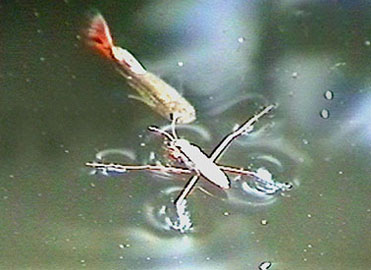 okružák těsně pod hladinou, kolem plave plankton a larvy komárů
