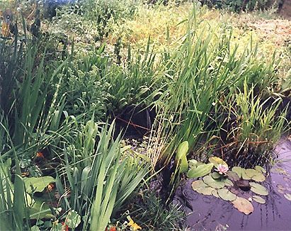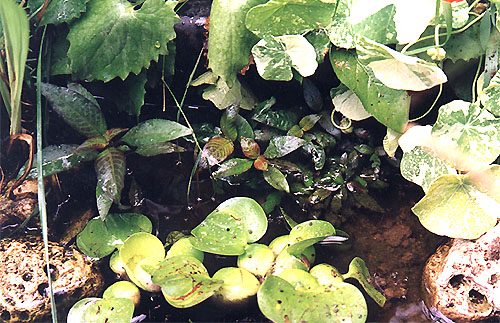 Z dalších rostlin byla pokusně umístěná v nízké "pobřežní" části jezírka akvarijní mokřanka Hygrophila.