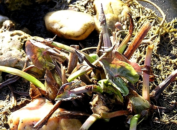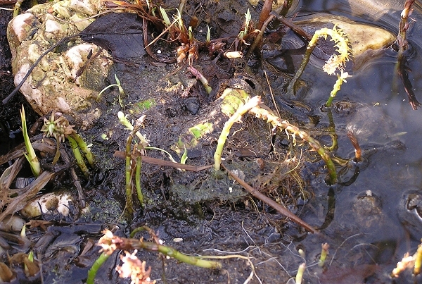 Nejdřív bylo třeba zkontrolovat stav vodních a bahenních rostlin. Rákos se musel vystříhat až po nově vyrašené výhony. Lekníny se probudily k životu a na všech byly vidět nové listy. Prustka vytvořila spoustu odnoží, stejně tak blatouch, kosatce a puškvorec ukazují v mělké části jezírka první listy. V košíku se šípatkou širolistou jsou vidět 3 výhony rašící z hlíz.