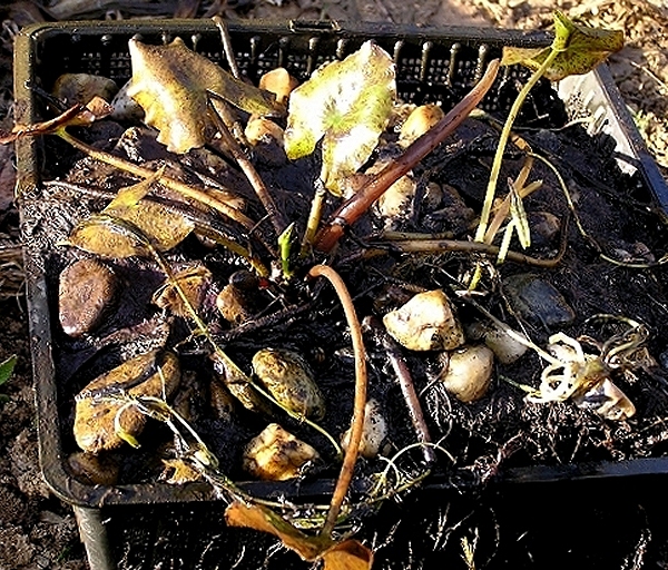 Lekníny mám teď umístěné v mělčím prosluněném jezírku, rákos a šípatku nechávám v menším hlubším jezírku.
