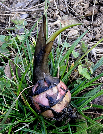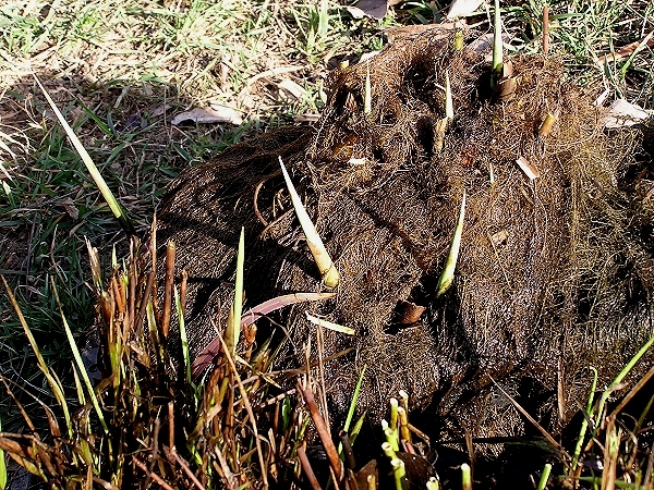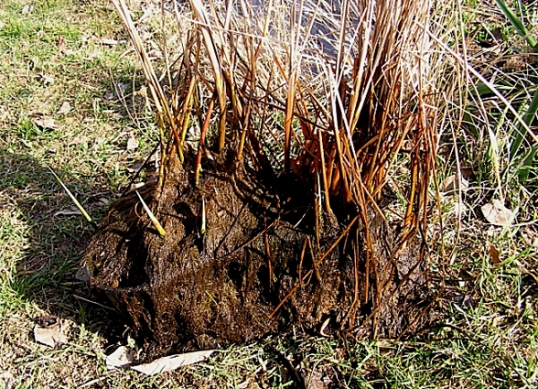 Staré listy ozdobných trav mám sestřižené a listí, které v zimě bránilo jejich vymrznutí je vyhrabané. Dvě malé sazenice Cortaderia zakoupené na podzim, bylo potřeba vyndat z původních květináčků, ve kterých byly zazimované ve sklepě. Nyní jsou sesazeny do větší nádoby a s ní zakopány do záhonu na kraji jezírka. Staré uschlé listy jim ustřihnu časem, až se jim objeví první výhony.