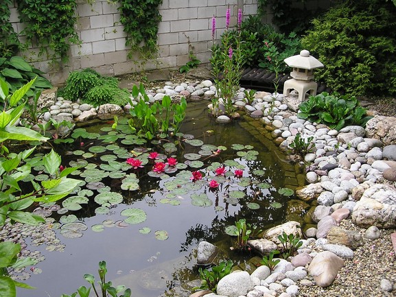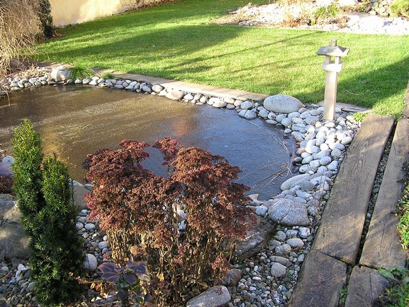 Břeh také pevně drží. Dlažebky se pod vodou z římsičky nepřevrátí a nepustí oblázky dolů. Další výhodou je možnost přímo do tohoto břehu vsadit mezi oblázky (bez zeminy) drobnější bahenní rostliny např. blatouchy a pomněnky bahenní, takže to vypadá zcela přirozeně. Ale pozor : spodní část břehu (tedy pod římsou z dlažebek) a dno nechte zásadně holé bez oblázků. Při čištění jezírka by velice překážely a stejně se časem pod vodou potáhnou vrstvičkou řas a slizu, takže žádnou parádu nenadělají.